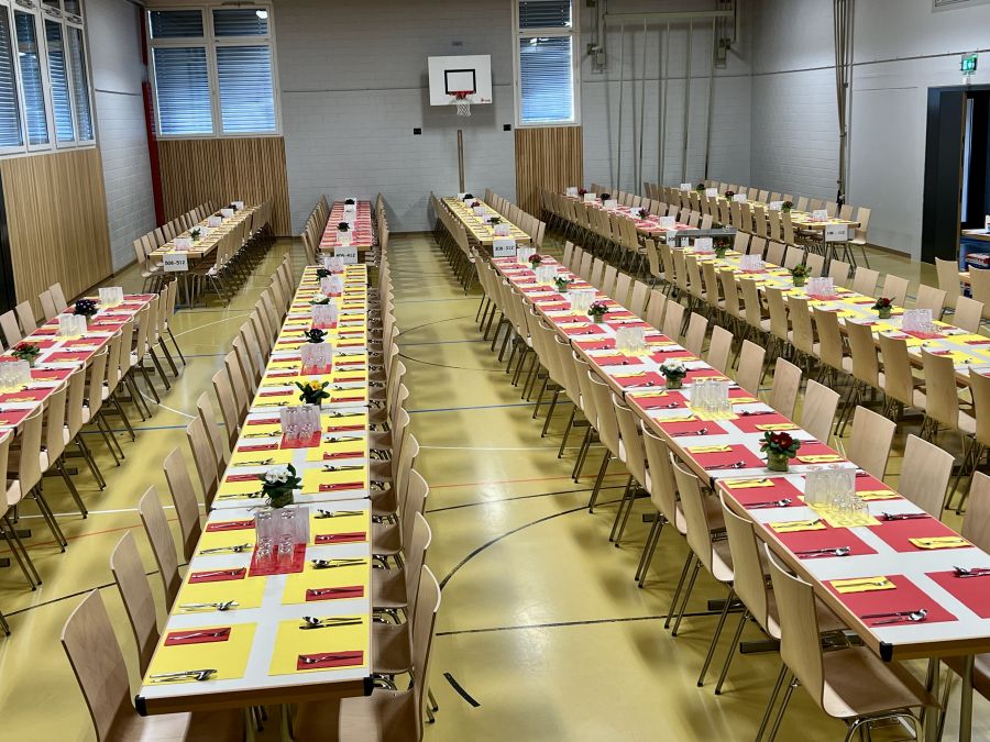 Während im Hintergrund weiterhin Essen angerichtet und serviert wurde, gespült, abgeräumt und koordiniert wurde, fanden sich in der Halle Bekannte, Nachbarn, Kollegen oder alte Schulfreunde zum gemeinsamen Essen und zahlreichen Gesprächen zusammen.